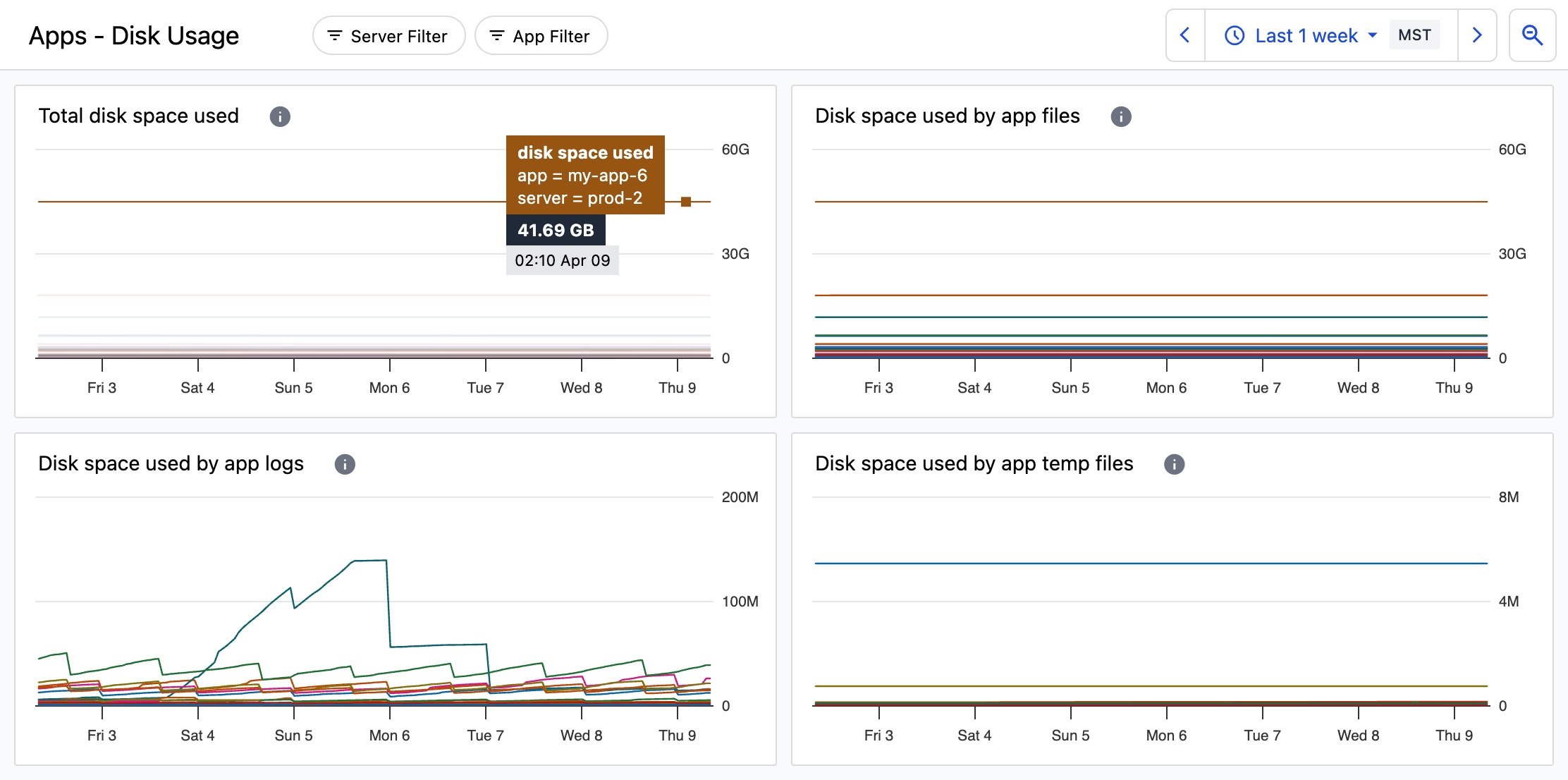 The Apps - Disk Usage dashboard provides disk usage information for each app, including total disk usage as well as specific types of disk usage.
