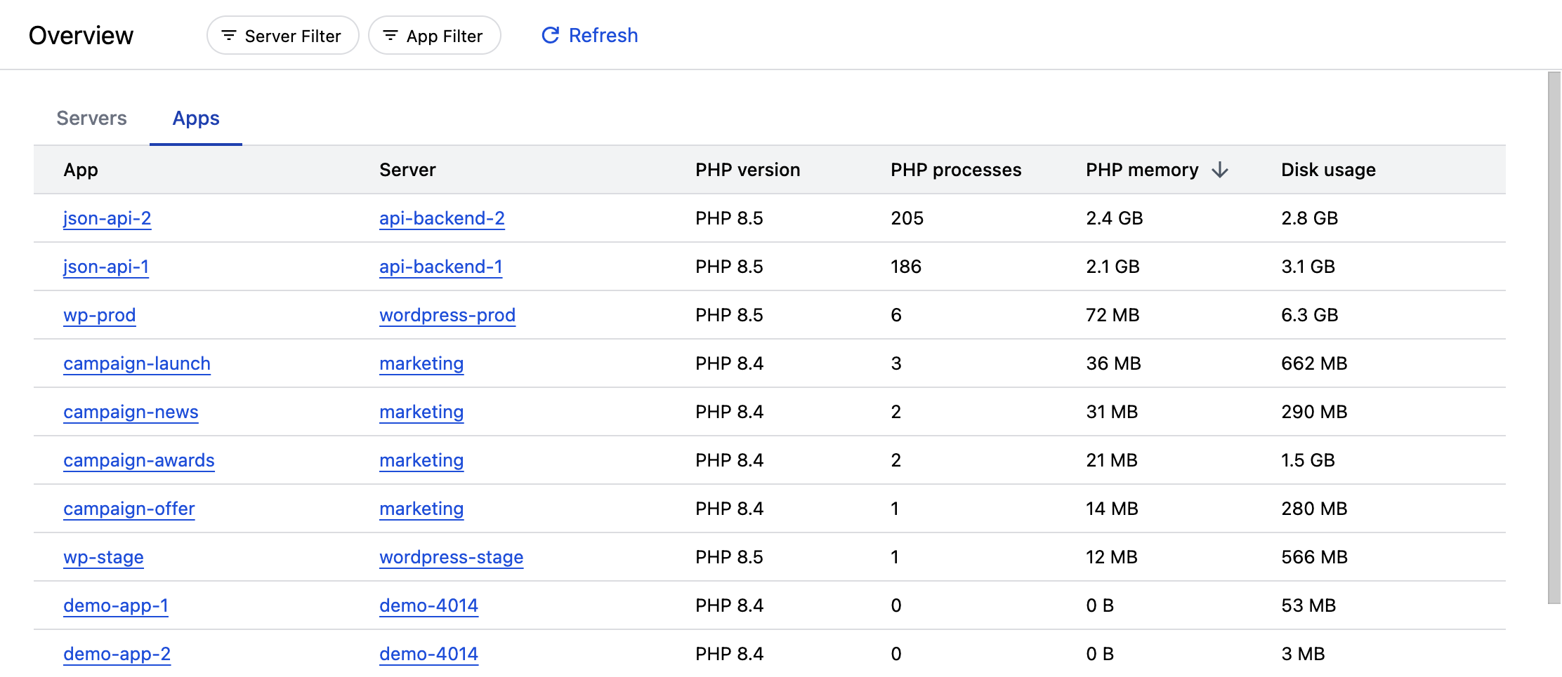 Filter by server or app