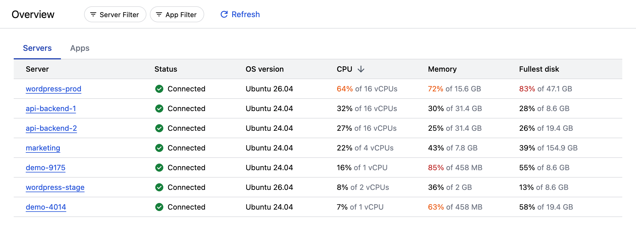 To only show items related to a single server or app, click +Server Filter or +App Filter at the top of the resource list.